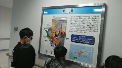炉を見学しました。銀色の筒の中が燃えているなんて…。