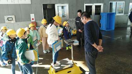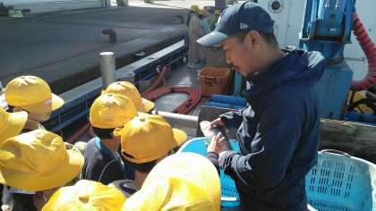 質問に答えてもらった後、魚の重さを測る機械で体重をはかってもらったり、ふくらぎに触らせてもらったり、船に乗せてもらったりしました。
