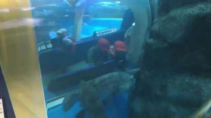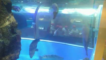 トンネル水槽は、やっぱりおもしろいというグループや、壁の絵の魚たちと背比べしているグループもありました。