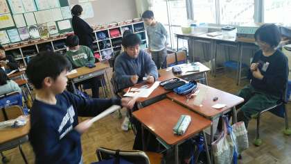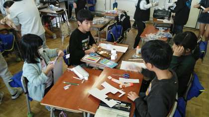 4年生の6時間目は、空気の力を使ったおもちゃづくりの時間でした。空気鉄砲の的を工夫してつくっているものが多かったです。