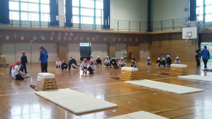 4年生の2時間目は、体育科の学習でした。スポーツ指導員派遣事業で、指導員に跳び箱を教えてもらいました。写真は、台上前転の練習をしているところです。