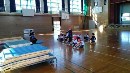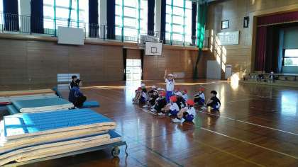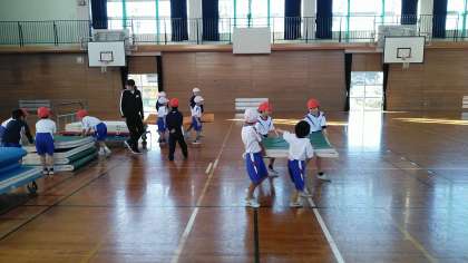 1・2年生の4時間目は、体育科の学習でした。マットを4人で安全に運ぶ方法を考えてから、マットを運んでいました。
