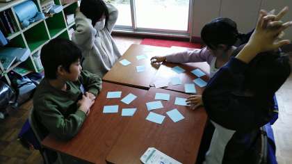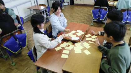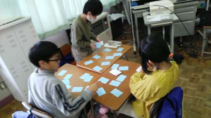 3年生の2時間目は、国語科の学習でした。「急がば まわれ」「猫に 小判」「泣きっ面に 蜂」など、自分たちでつくったことわざを完成させるカードゲームを楽しんでいました。