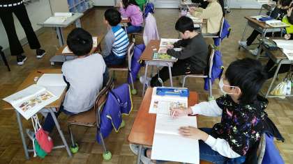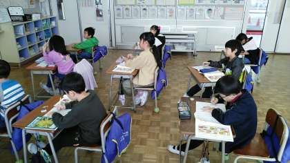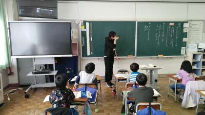 2年生の2時間目は、国語科の学習でした。カタカナで書く言葉を見付けていました。雨戸をしめる音は、「ガラガラ」。