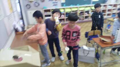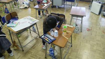 1年生の4時間目は、生活科の学習でした。秋見付けで集めたどんぐりや落ち葉等を生かして楽しいおもちゃ等をつくっていました。