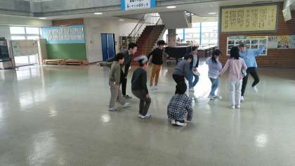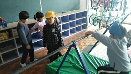 1年生は、鉄棒、3年生は、縄跳びでジャンプ、4年生は、コマで勝負していました。