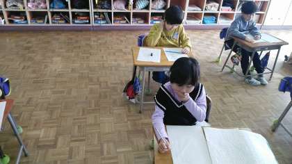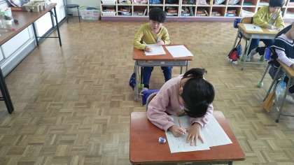 1年生の2時間目は、国語科の学習でした。友だちに聞いたことをメモにまとめ、それを見ながら文章を書いていました。この難しい作業をみんなできていてびっくりしました。