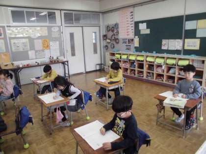 1年生の1時間目は、道徳の学習でした。昨日から始まった人権週間に合わせて、今日は「優しい人になるために大切にしたいことは何か」について考えました。「はしのうえの おおかみ」という話から、子供たちは「困っている人がいたら声をかける」「ゆずってあげる」など、自分にできることを真剣に考えていました。