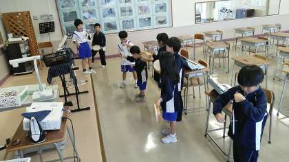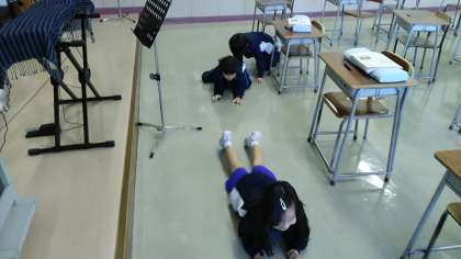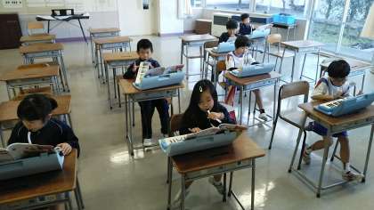 1年生の1時間目は、音楽科の学習でした。歌に合わせて動いたり、鍵盤ハーモニカで曲を吹いたりしたあと、打楽器を使って遊びました。タンブリンやトライアングル、カスタネットやすずを使ってリズム遊びを楽しみました。