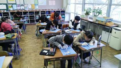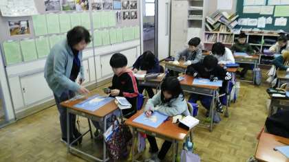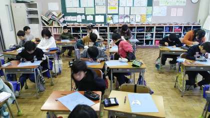4年生の2時間目は、図画工作科の学習でした。木版画をしていました。自画像だそうで、丁寧に彫刻刀で掘り進めていました。