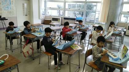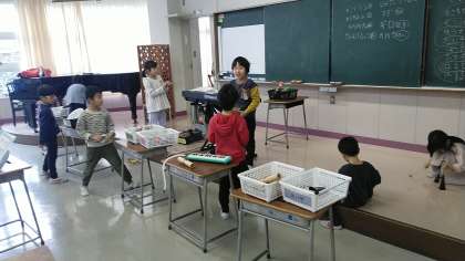 1年生の1時間目は、音楽科の学習でした。鍵盤ハーモニカの練習をしたあと、いろいろ打楽器を使ってリズム遊びをしました。