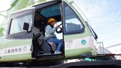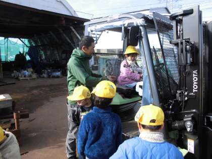 3種類の働く車を見せていただいた後、クレーン車とフォークリフトの運転席に乗せていただきました。普段近付いて見たり、乗ったりすることができない車を目の前に、子供たちは大興奮でした。内田鉄工さん、ありがとうございました。
