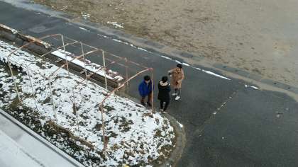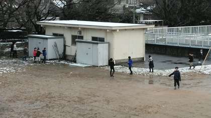 グラウンドで残っている雪で雪合戦。