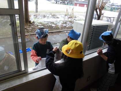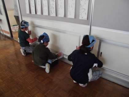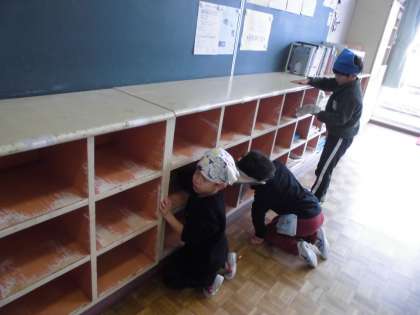 1年生の5時間目は、大掃除をしました。人数も少ないので、場所を決めて少しずつ大掃除をしていきます。今日は、ロッカーや窓枠、扉を掃除しました。雑巾を絞り、普段なかなかできない場所を、友達と協力してきれいにしていました。