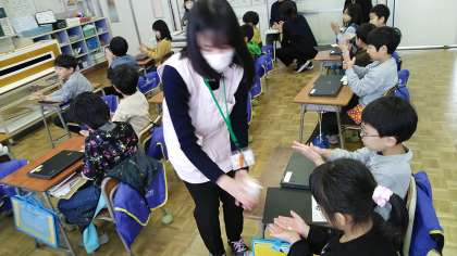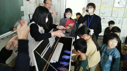 1・2年生の4時間目は、手洗いについての学習でした。養護教諭の先生から魔法の薬をかけてもらい、手洗いしたあとにブラックライトをあてると、洗い残しがよくわかりました。学習後は、丁寧に手を洗っている子供たちでした。