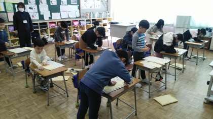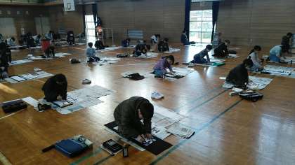 始業式のあと、校内書き初め大会がありました。1・2年生は、教室で、3〜6年生は、体育館で行いました。