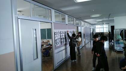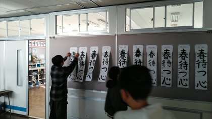 校内書き初め大会で書いたものの中から一番うまく書けたものを選んで掲示しました。保護者の皆様は、1月10日(水)〜1月11日(木)の15:45〜16:30に見ることができます。お時間のある方は、ぜひご来校いただけたらと思います。よろしくお願いします。