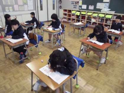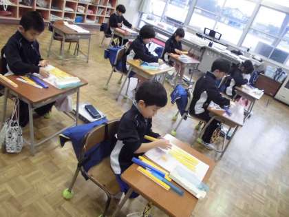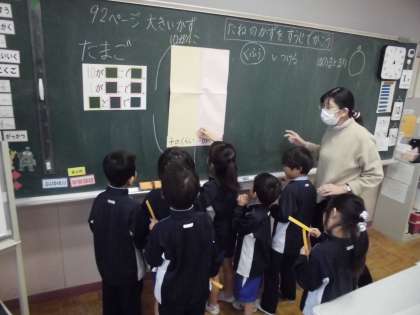 1年生の1時間目は、算数の学習でした。「一の位」「十の位」を覚え、「10が4こで40」等、学習しました。クラスのみんなで黒板に数ブロックを置いたり、自分でも数ブロックを操作したりして、大きい数に慣れようとがんばっていました。