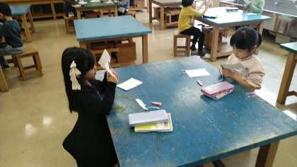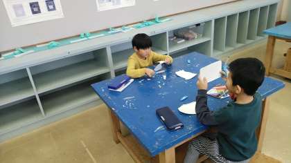 1年生の4時間目も図画工作科の学習でした。今度は、ハサミで切った紙の形から想像したものを描いていました。