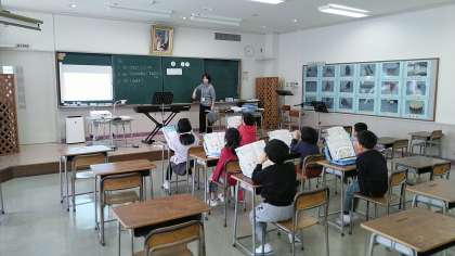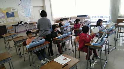 1年生の2時間目は、音楽科の学習でした。音楽室で鍵盤ハーモニカを使ってリズムづくりをしていました。