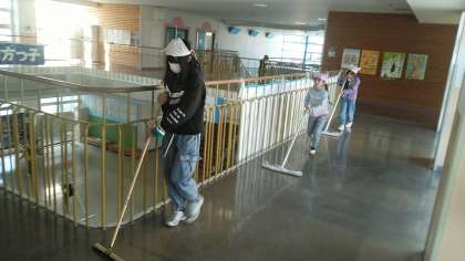 今日から新しい清掃場所にかわったそうです。いろいろところで上の学年の子供が下の学年の子供に教えていました。