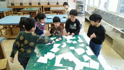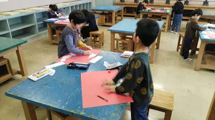 1年生の4時間目は、図画工作科の学習でした。いろいろな形の紙の中から、自分が描きたいものが見えてきた紙を選んで、絵を描きました。