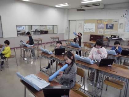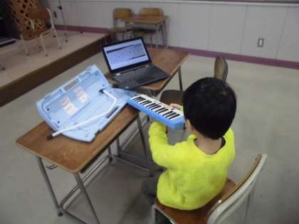 1年生の1時間目は、音楽の学習でした。先週つくった友達の旋律を見ながら、楽しく演奏しました。