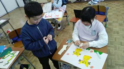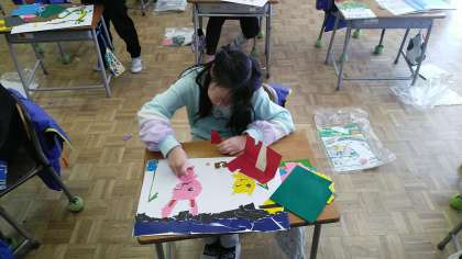 2年生の5時間目は、図画工作科の学習でした。色のシールを貼って、版をつくっていました。