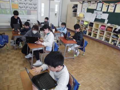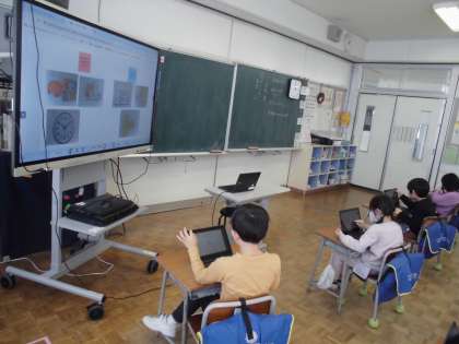 2年生の5時間目は、算数の学習でした。校舎内にある数字(時計や掲示物等)を写真に撮り、クロームブックのジャムボードに貼り付けました。そして「ものの大きさを表しているもの」「ものの大きさを表していないもの」に分け、身の回りにある数字に関心を高めていました。