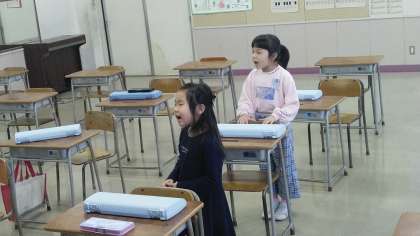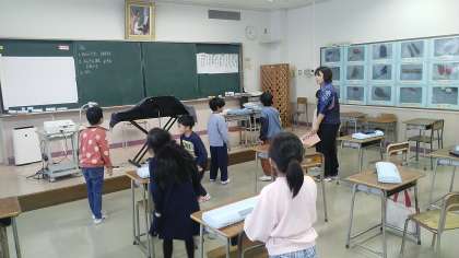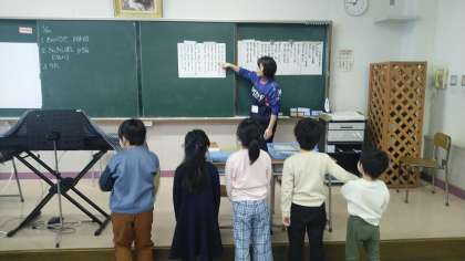 1年生の1時間目は、音楽科の学習でした。ちょうど「みんなの町 四方」と「創校記念日の歌」の練習をしていました。「みんなの町 四方」は、感謝の集いで、「創校記念日の歌」は、創校記念式で全校で歌う予定です。