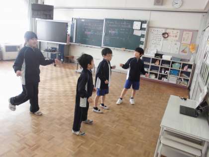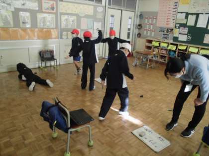 1・2年生の2時間目は、体育の学習でした。担当パートのダンスをつくるために、友達とアイディアを出し合っていました。