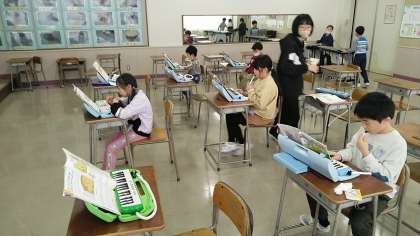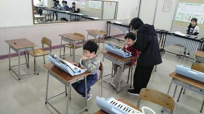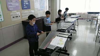2年生の4時間目は、音楽科の学習でした。音楽室でリコーダーや鉄琴、木琴等を使って合奏の練習をしていました。