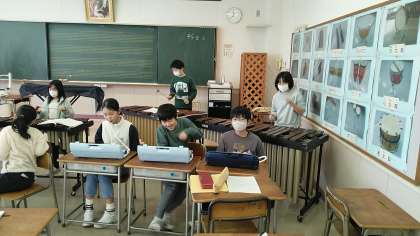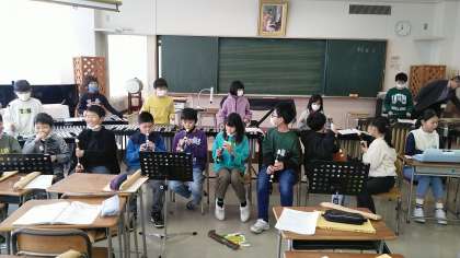 4年生の4時間目は、音楽科の学習でした。「茶色の小瓶」という曲の合奏の練習をしていました。全体で通して練習していました。もうすぐ完成です。