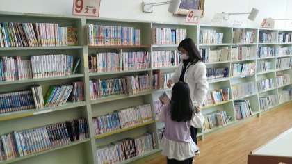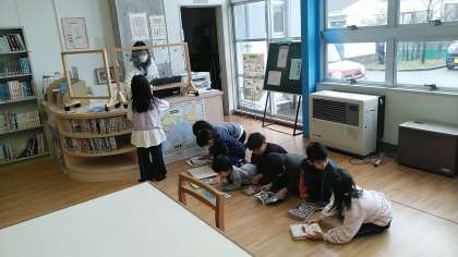 4時間目の終わり頃、図書ラウンジに1年生がいました。みんなで本を借りているところでした。たくさん読んでくださいね。
