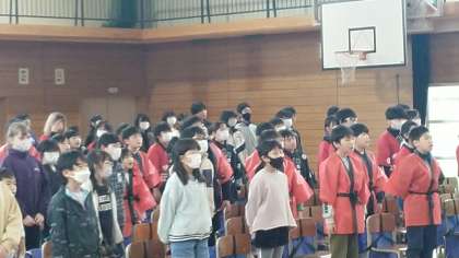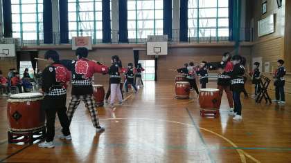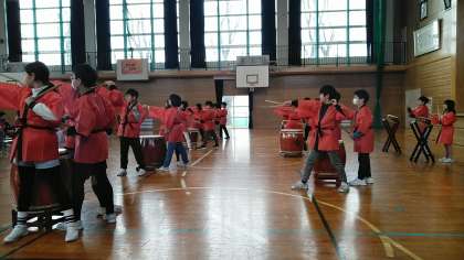 「創校記念日の歌」を歌ったあと、4年生と5年生の祝い太鼓の披露がありました。