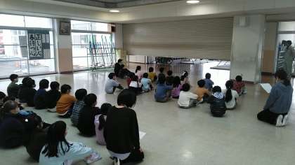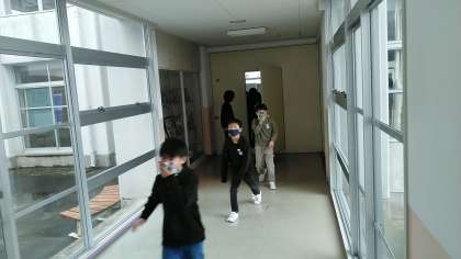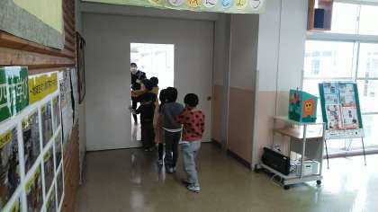 今日の避難訓練は、防火シャッターの下りるところを確認したり、防火扉をくぐったりする訓練でした。