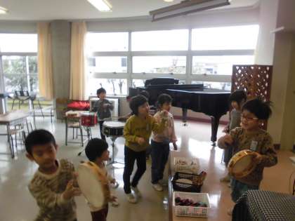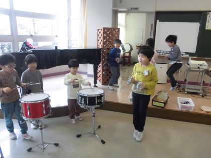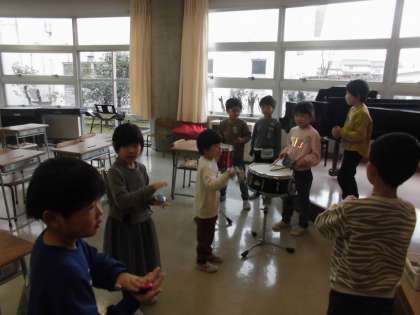 1年生の2時間目は、音楽の学習でした。卒業式の歌を練習した後、「こうしんきょく」という曲に合わせ、様々な楽器を使って、曲のリズムや楽器の音を楽しみました。