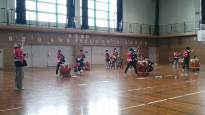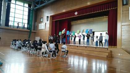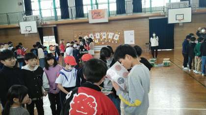 4年生は、お祝いの歌「365日の紙飛行機」、5年生が祝太鼓「煌」の発表でした。そのあと、縦割り班ごとにメッセージカードを渡しました。