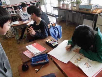 4年生の4時間は、国語の学習でした。グループで一つ調査したいテーマを決め、アンケートをつくっていました。この後、クラス全員がそれぞれのグループのアンケートに答えるそうです。