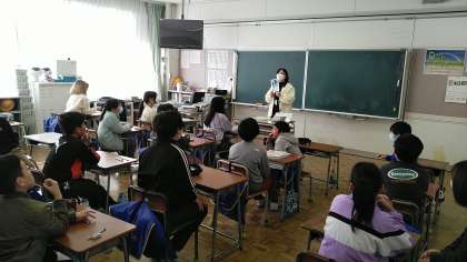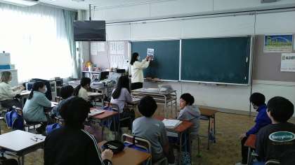 5年生の2時間目は、外国語科の学習でした。クローズアップした写真の一部を見て、何の写真かを英語で言うゲームを楽しんでいました。