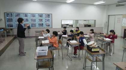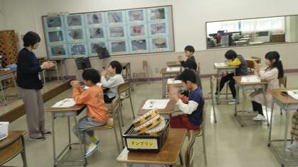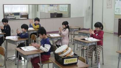 1年生の1時間目は、音楽科の学習でした。これから演奏する楽器のリズムを手拍子で確認していました。