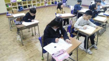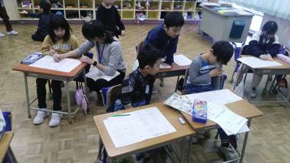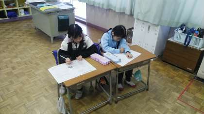 2年生の1時間目は、算数科の学習でした。たし算の計算ピラミッドを解いていました。もうすでに終わった人もいるみたいです。