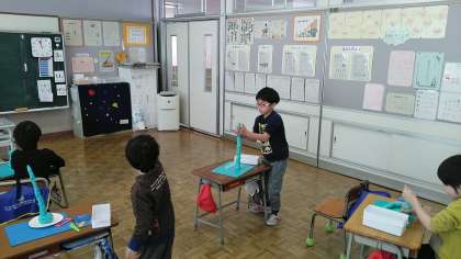 1年生は、図画工作科の時間に誰が粘土を一番高くできるか挑戦しました。太いと低いまま…。細くすると倒れてきてしまう…。みんないろいろ工夫しながら高く高くしていました。