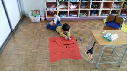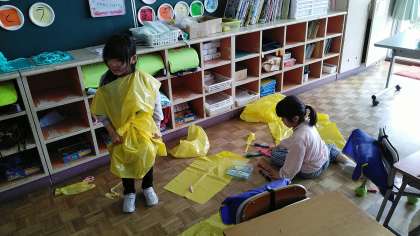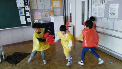 1年生の4時間目も、図画工作科の学習でした。黄色と赤色の袋を使って服をつくったりして遊びました。