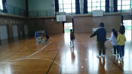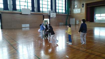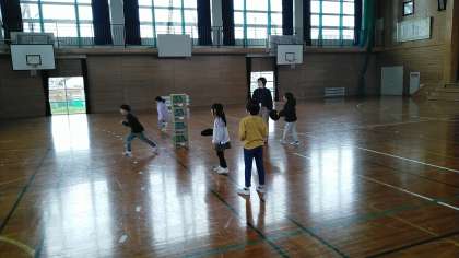 1年生は、帰りの用意をしたあと、体育館でフリスビーをしていました。
