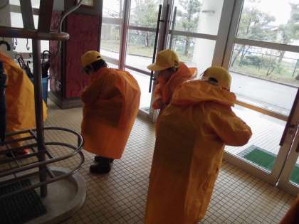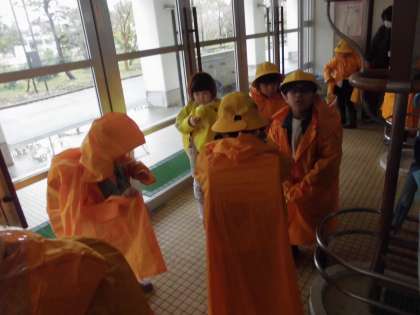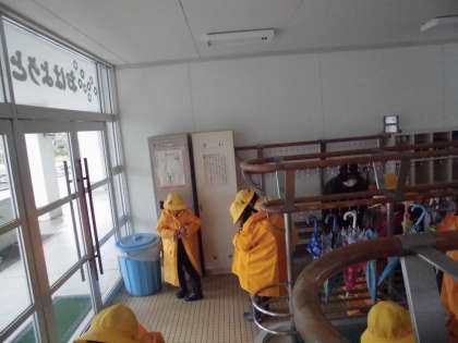1年生が下校する頃、まだ雨が降っていたので、クラスみんなで合羽を着ました。一人で上手に合羽を着ることができていました。ご家庭での練習、ありがとうございました。