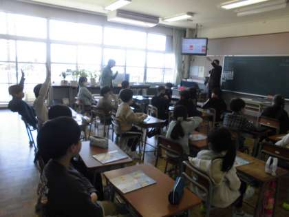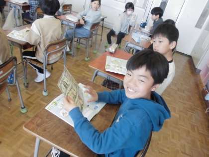 4年生の4時間目は、外国語活動でした。ALTの先生から、アメリカのお金を見せてもらうと、すぐに日本のお金との違いに気付いていました。3年生から外国語活動をしているので、ALTの先生の言葉を理解する子供たちがとても多かったです。