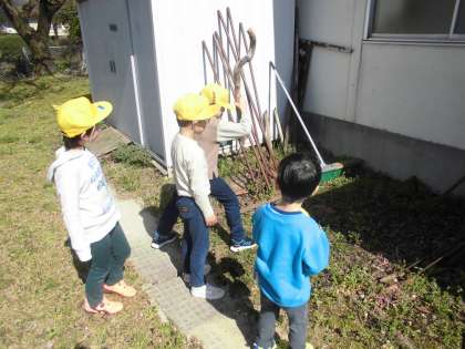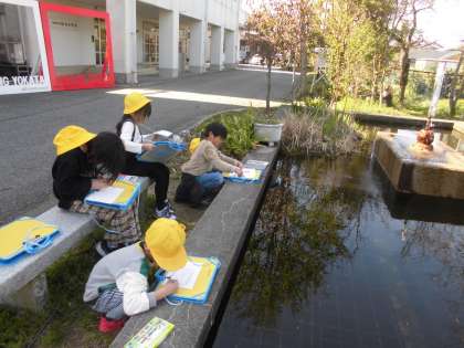 2年生の6時間目は、図画工作科の学習でした。2年生になって初めての6時間目。今日は、外に出て、見付けたものを絵に描いていました。蛙を見付けて追いかけたり池の鯉をじっくり見たりしていました。