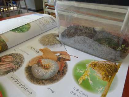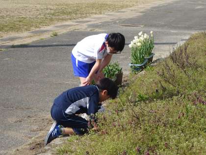 4年生は外に出て、生き物を探していました。木の根元、土の中、石の裏等いろいろなところを探していました。暖かくなり、いろいろな生き物たちが活動を始めています。見付けた幼虫が何の幼虫か、調べる姿も見られました。