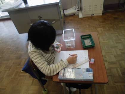 3年生の6時間目は、理科の学習でした。とっても小さいモンシロチョウの卵をじっくりと観察したり、友達と見合ったりしながら、観察カードにまとめていました。